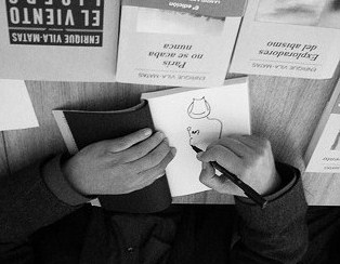 Precisamente empecé a hacerlo en otoño del 89 en mi viaje por Alemania. No sé por qué esbocé un sombrero a lo Pessoa en una dedicatoria y repetí el dibujo a tres o cuatro lectores más y me pareció que éstos se iban encantados, como si mi sombrero le diera más valor, en todos los sentidos, al libro. Estábamos en Stuttgart y el dueño de la librería en la que firmaba me caía antipático, porque me había parecido que se comportaba de forma muy tacaña conmigo (fue el único en toda la gira alemana que no me buscó hotel y me hizo dormir en su casa, rodeado de dibujos de amigos poetas que le habían felicitado en su sesenta aniversario; es más, la habitación en la que me había hecho dormir, tenía una placa en la entrada en la que se leía: “Habitación de los poetas”; bueno, no pude dormir en toda la noche, no sabes lo juerguistas que son los poetas cuando ejercen de fantasmas). El hecho es que el último libro que firmé aquel día se lo firmé al librero de Stuttgart y no le puse el dibujo. Al poco rato, vino enojadísimo (como si le hubiera costado dinero que no le hubiera colocado allí el dibujo del sombrero), exigiendo que completara mi dedicatoria. “¡Quiero el dibujo!”, gritaba. Me montó un número tan grande que desde entonces no me atrevo a no hacer el dibujo por miedo a que vuelva a repetirse aquel escándalo.